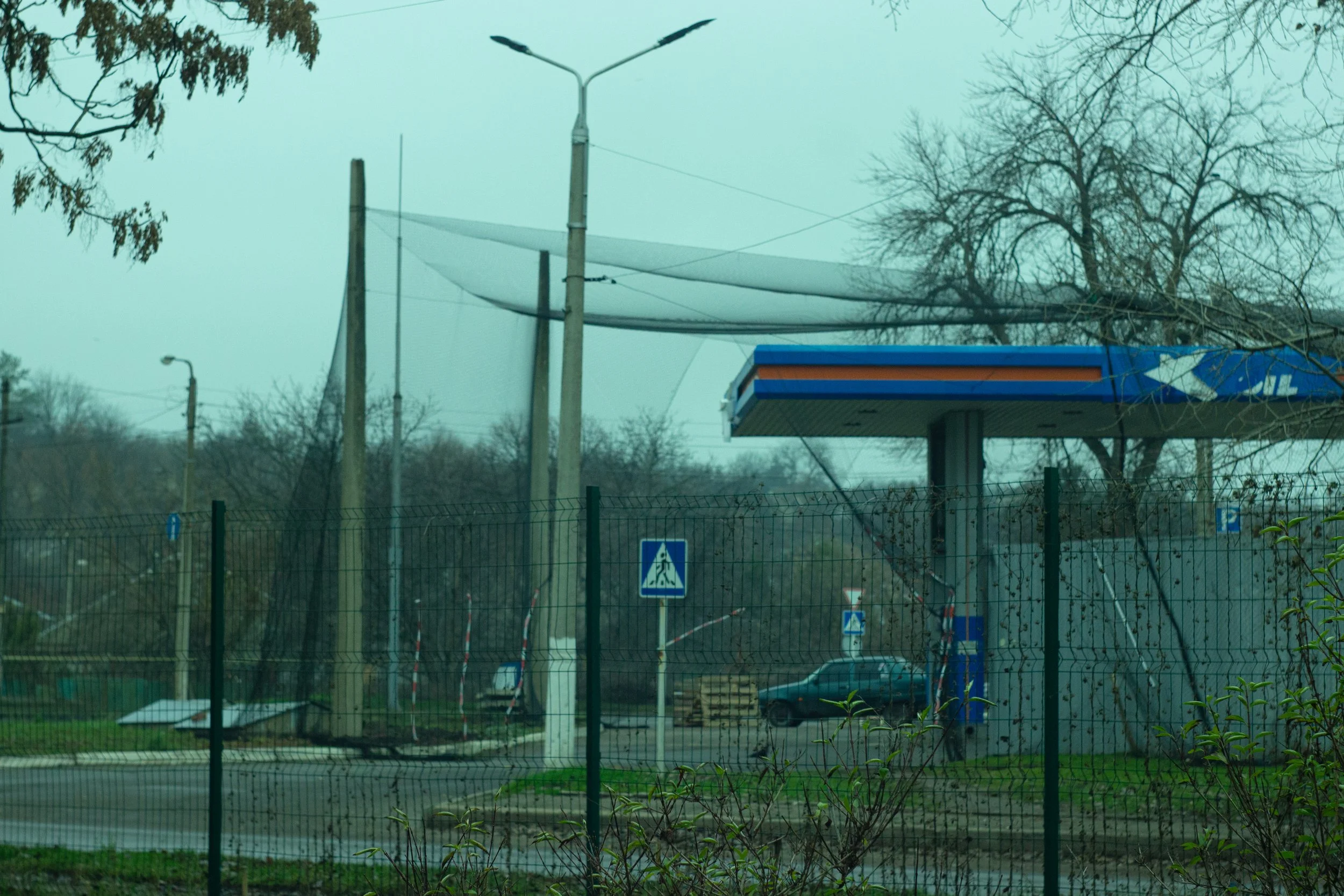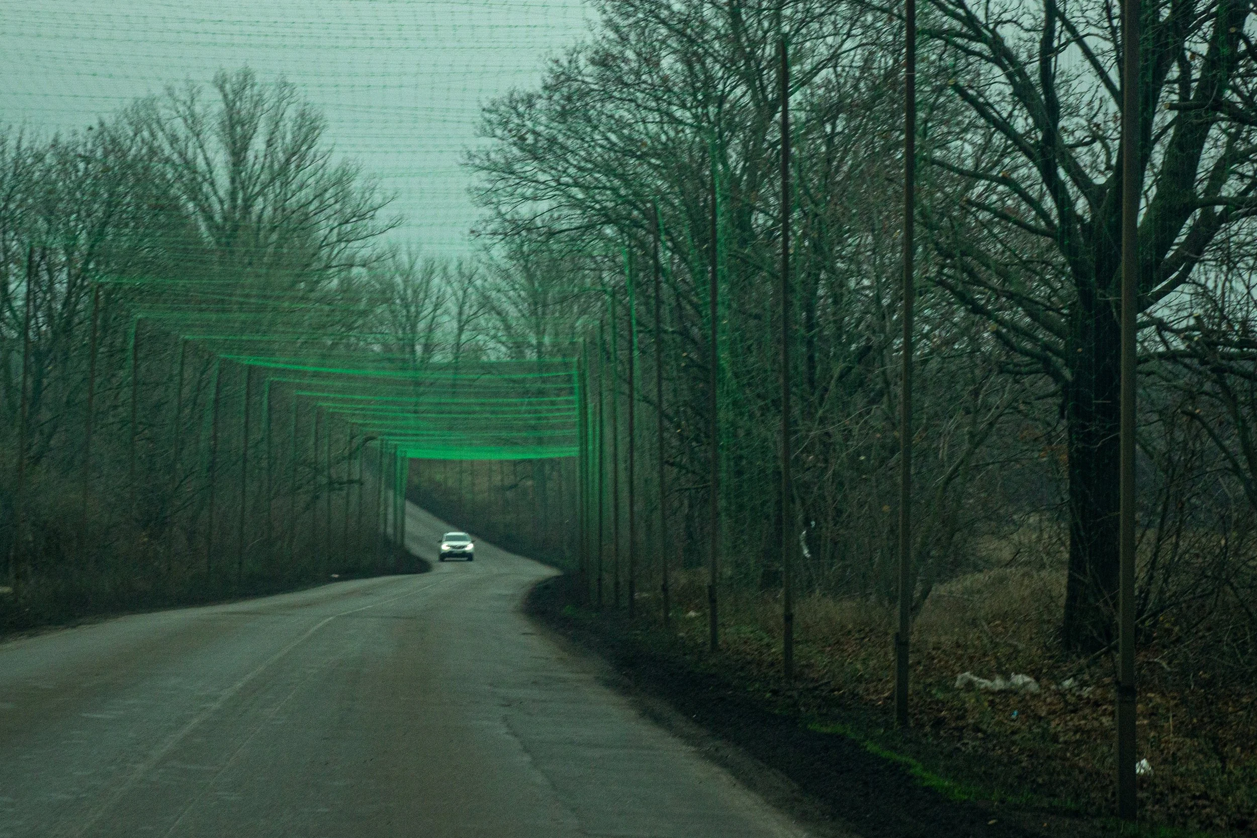 Auf der Fahrt von Dnipro nach Kramatorsk. Die letzten 50km (oder mehr, wir haben nicht auf den Zähler gesehen) der holprigen Überlandstrasse sind mit Netzen vor Drohnen geschützt.