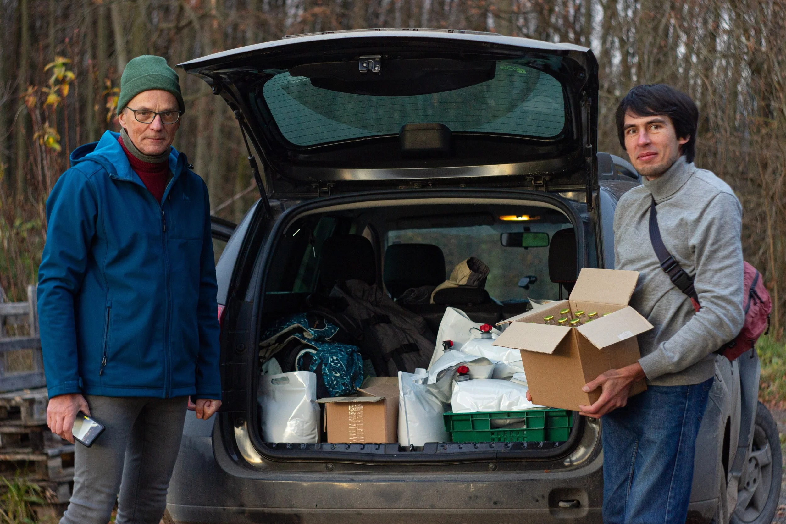 Kurz vor der Abfahrt, Ende November. Wir laden hausgemachten Apfelsaft, kleine Geschenke für unser alten und neuen Freunde im Osten.